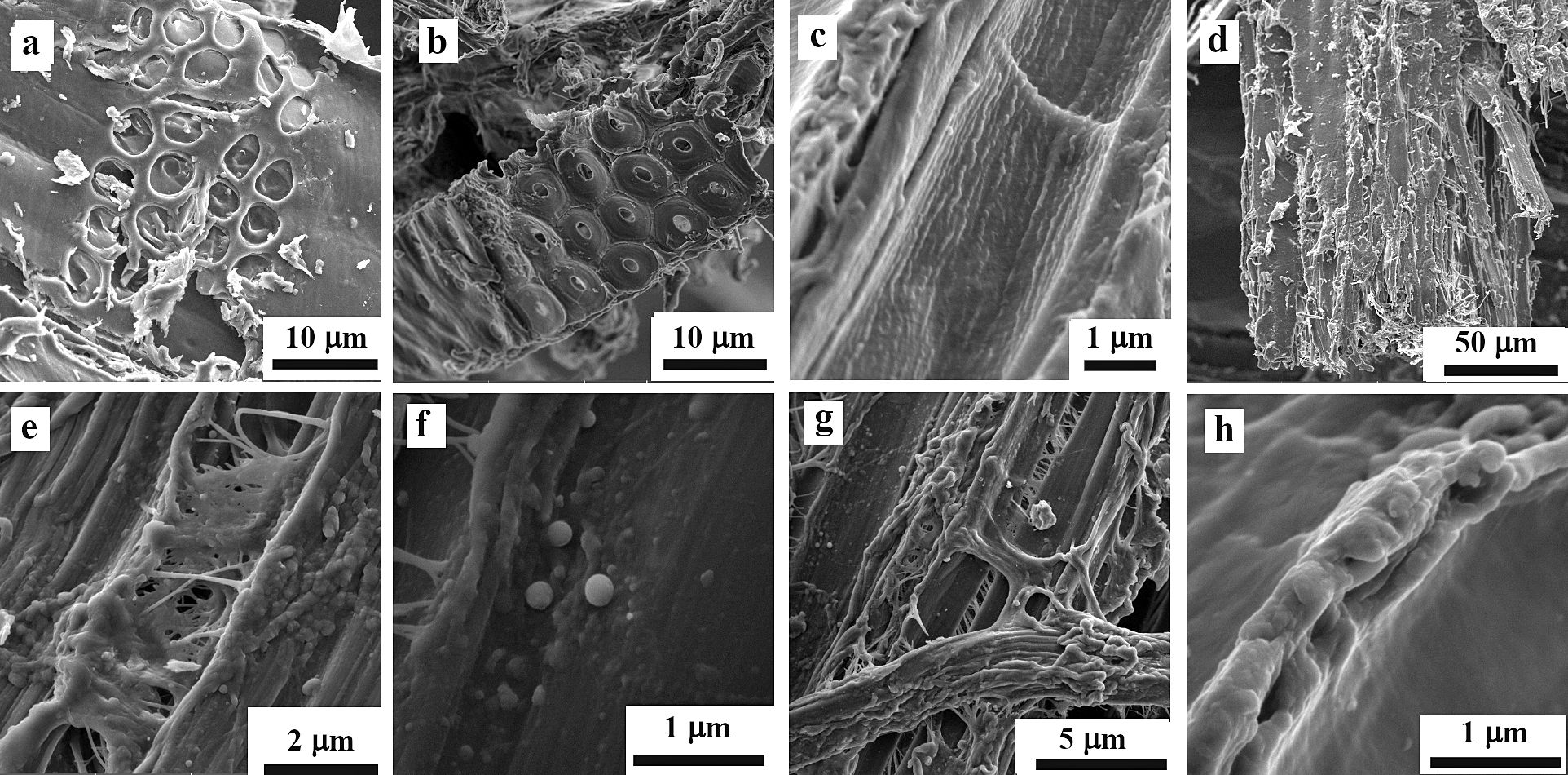 На рис. 5, a—d представлены электронные микрофотографии образцов исходной сосновой коры, на которых присутствуют характерные морфологические образования растительной ткани: сосудистые, трахеидные и волокнистые элементы, фрагменты клеточной структуры. Рис. 5, e—h демонстрирует исходный материал после проведения гидрофобизации. Отмечается эффект обволакивания морфологических элементов осевшим гидрофобизатором. Кроме этого, наблюдаются отдельные глобулы гидрофобизатора (рис. 5, f, g). Принципиально важным является факт сохранения пористой структуры растительной ткани (рис. 5, е, h), характерной для исходной коры. С одной стороны, оседание сульфатного мыла на растительных волокнах придает исходному материалу свойства гидрофобности, что является необходимым условием для сбора нефти и нефтепродуктов. С другой стороны, сохранившаяся пористость создает развитую внутреннюю поверхность получаемого продукта, что обеспечивает протекание процесса физической сорбции.