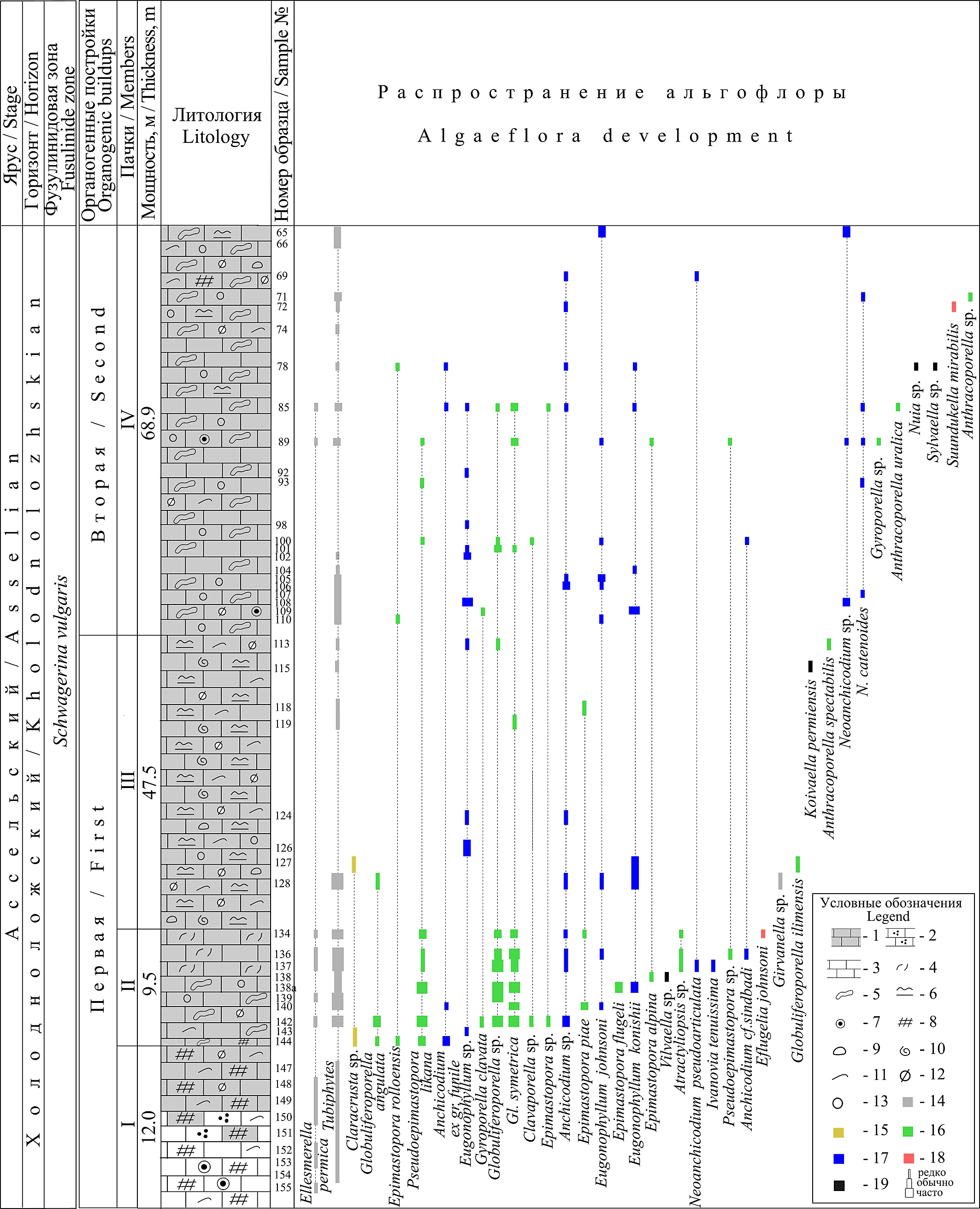 1—3 — types of limestones: 1 — biocementolites, 2 — clotty, 3 — bioclastic; 4—19 — organic remains: 4 — bioclasts, 5 — algae, 6 — Palaeoaplysina, 7 — crinoids, 8 — bryozoans, 9 — ostracods, 10 — goniatites, 11 — brachiopods, 12 — fusulinides, 13 — small foraminifera, 14 — cyanobacteria, 15 — green algae of the order Siphonocladales, 16 — green algae of the order Dasycladales, 17 — green algae of the order Siphonales, 18 — red algae, 19 — incertae sedis