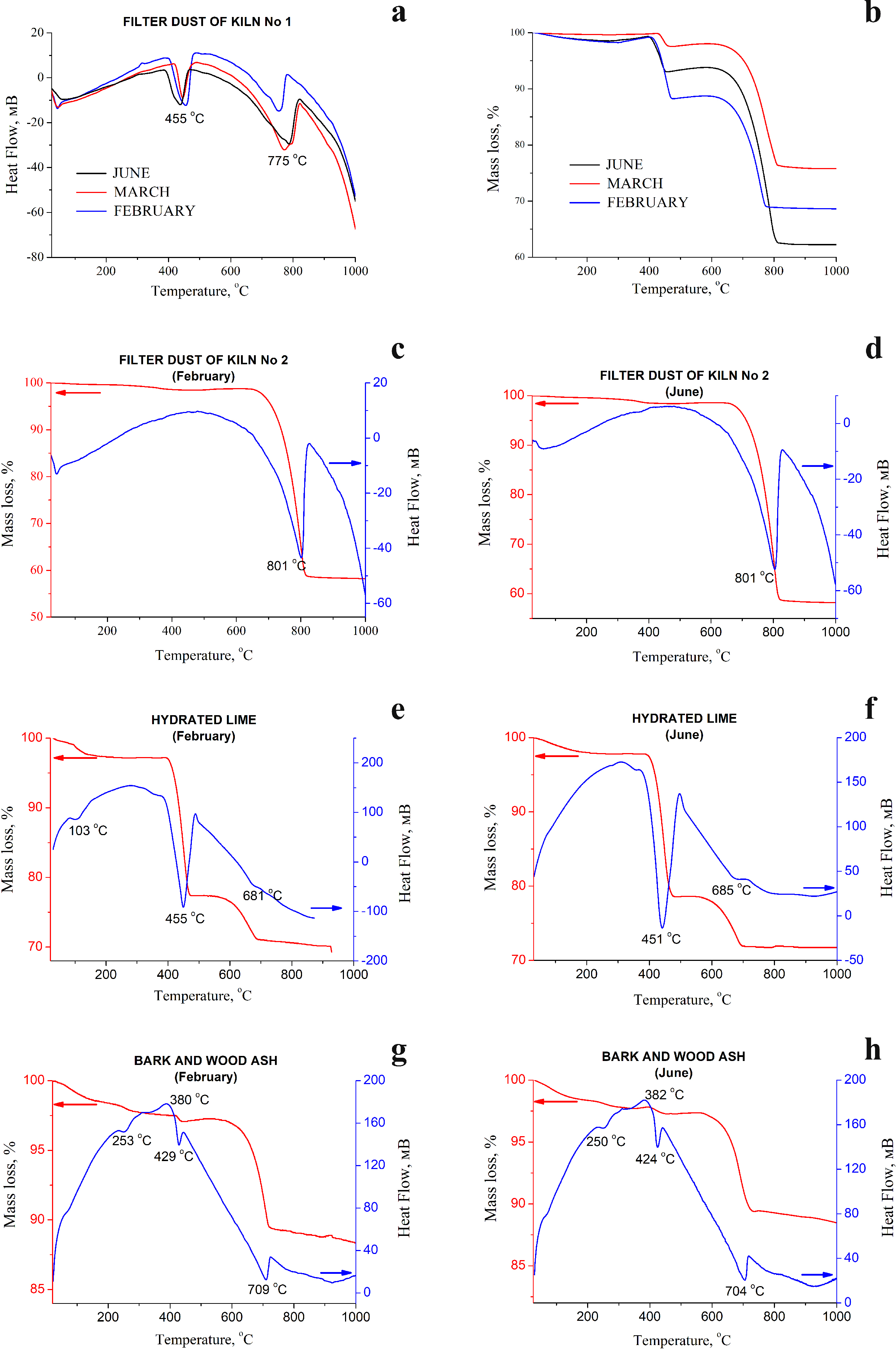Рис. 3. Кривые нагревания образцов пыли электрофильтров печи № 1 (a, b), печи № 2 (c, d), гашеной извести, полученной из некондиционного оксида кальция (e, f), кородревесной золы (g, h), отобранных в разное время