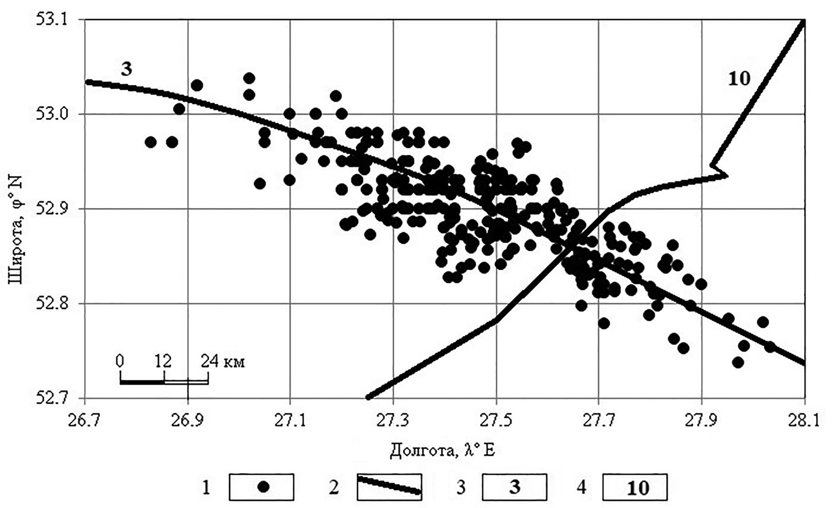 Fig. 2. Map of earthquake epicenters within the seismically active zone area of the Lyakhovichi regional fault in 1983 — 2021: 1 — earthquake epicenter, 2 — fault line, 3 — Lyakhovichi fault, 4 — Stokhod-Mogilev fault