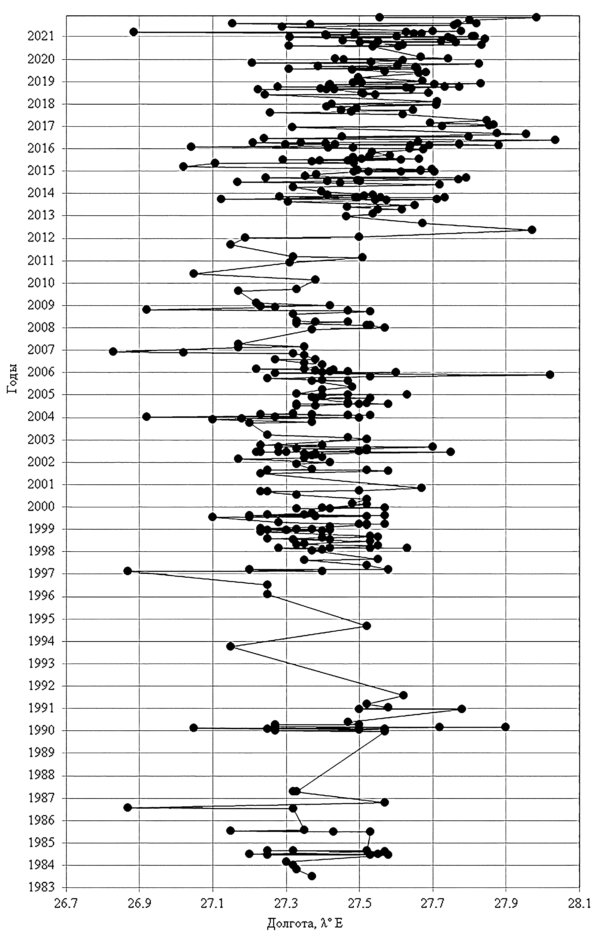 На рис. 3 представлено пространственно-временное распределение эпицентров землетрясений в проекции на долготу за период 1983—2021 гг. Землетрясения по Ляховичскому региональному разлому распределены неоднородно в пространстве и во времени. Выделение этапов неоднородного проявления сейсмичности проводилось на основе параметров сейсмической активности и площадного расположения эпицентров землетрясений.
