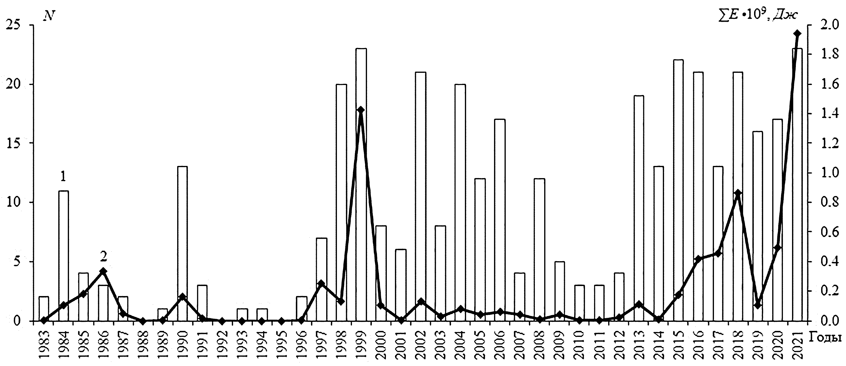 Долговременный график распределения числа землетрясений и суммарной выделившейся сейсмической энергии по годам в активной зоне Ляховичского регионального разлома за период 1983—2021 гг. представлен на рис. 4.
