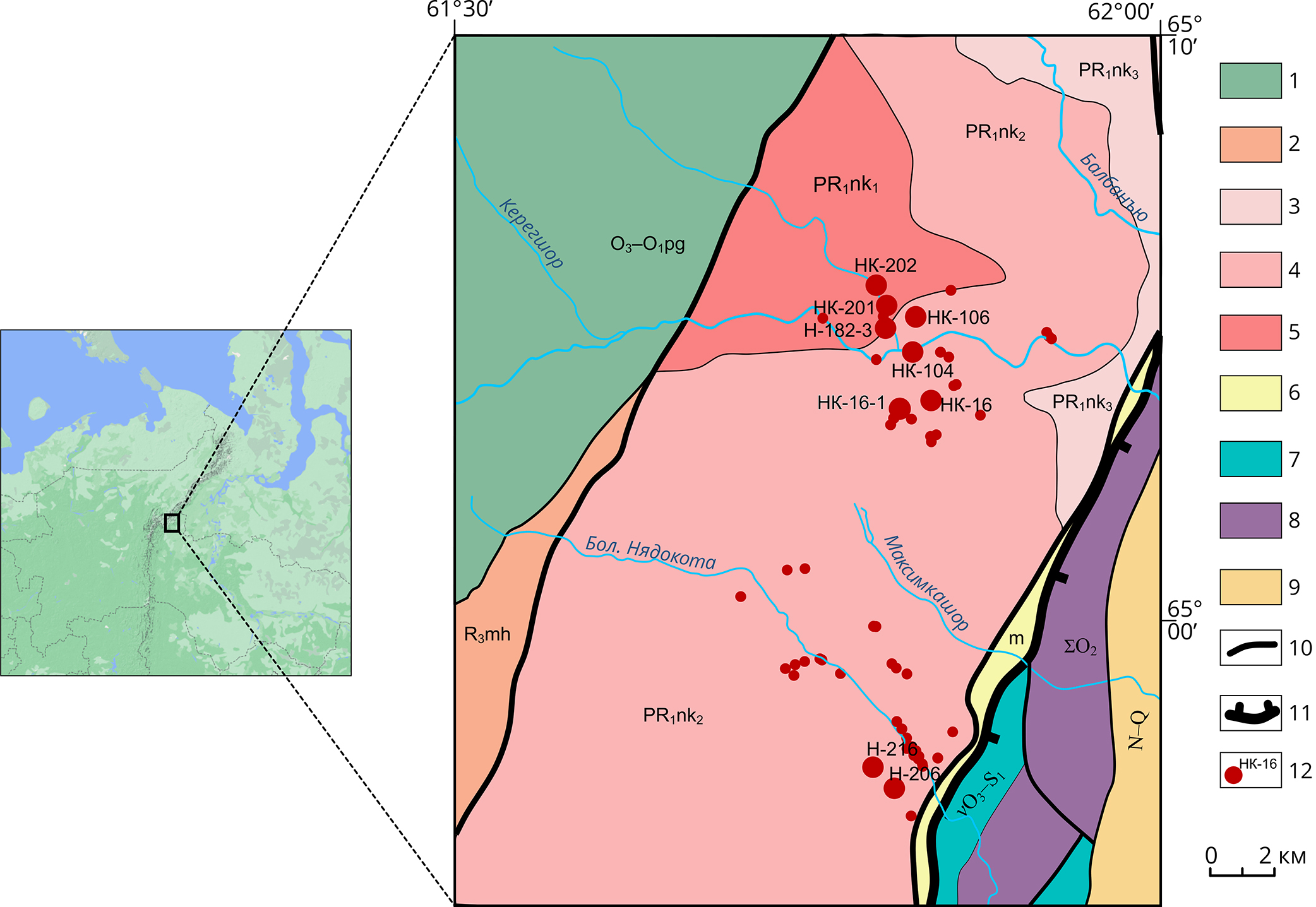 Fig. 1. Location diagram and geological structure of the Nerkayu complex of the northern part of the Subpolar Urals (State…, 2007): 1 — Pogurey Formation (undivided formations O3–O1pg); 2 — Malokhosainskaya strata (R3mh); 3–5 — Nerkayu formation: 3 — upper subformation (PR1nk3): crystalline schists, amphibolites, eclogites, quartzites, gneisses; 4 — middle subformation (PR1nk2): crystalline schists, amphibolites, quartzites, gneisses; 5 — lower subformation (PR1nk1): crystalline schists, amphibolites, eclogites, quartzites, gneisses; 6 — Kempirsay-Voykar tectonite complex (m); 7 — gabbro complex (νO3–S1); 8 — hypermafic complex (ΣO2); 9 — Neogene-Quaternary deposits (N–Q); 10 — boundaries of the Nerkayu complex; 11 — Main Ural fault (thrust); 12 — places of sampling
