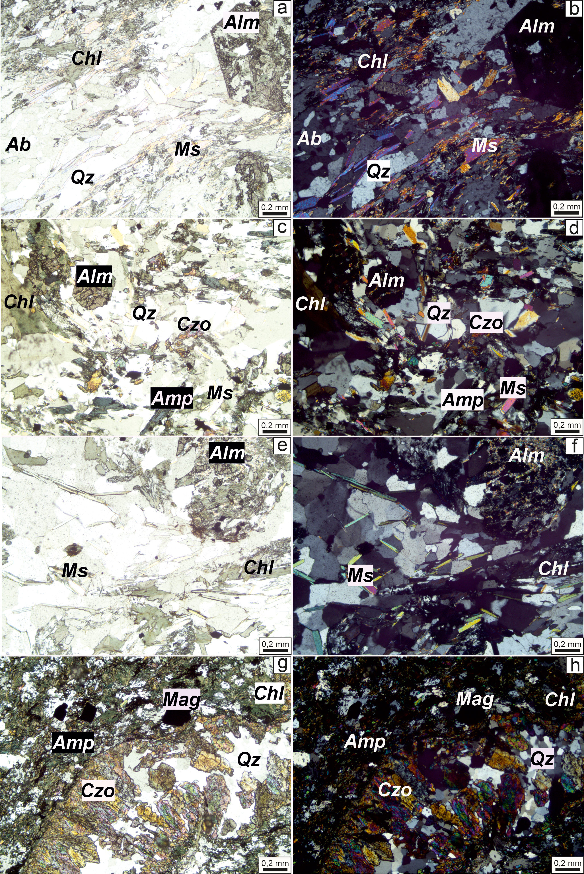 Fig. 2. Garnet quartz-clinozoisite-amphibole-chlorite-muscovite-albite schists (nk-14) — a–b; silicified, chloritized schist (nk-201) — c–d; garnet-muscovite gneiss-like schist (n-216) — e–f; quartz-clinozoisite-chlorite-amphibole-albite schists (nk-202) — g–h. Photos were taken in parallel and crossed nicoles: Alm — almandine (garnet), Amp — amphibole, Ms — muscovite, Qz — quartz, Ab — albite, Czo — clinozoisite, Mag — magnetite, Chl — chlorite