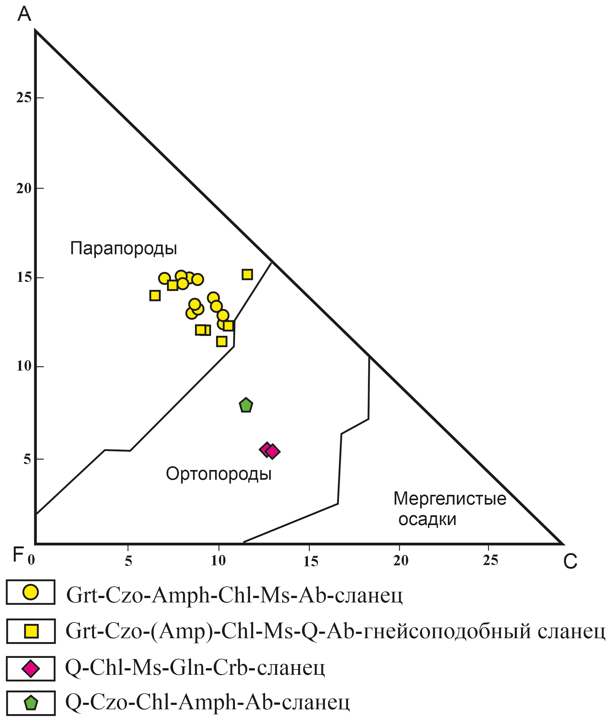Рис. 3. Диаграмма для разделения пара- и ортопород по А. Нематову (Ефремова, Стафеев, 1985): Grt — гранат, Czo — клиноцоизит, Amp — амфибол, Chl — хлорит, Ms — мусковит, Ab — альбит, Q — кварц, Gln — глаукофан, Crb — карбонат, Ep — эпидот