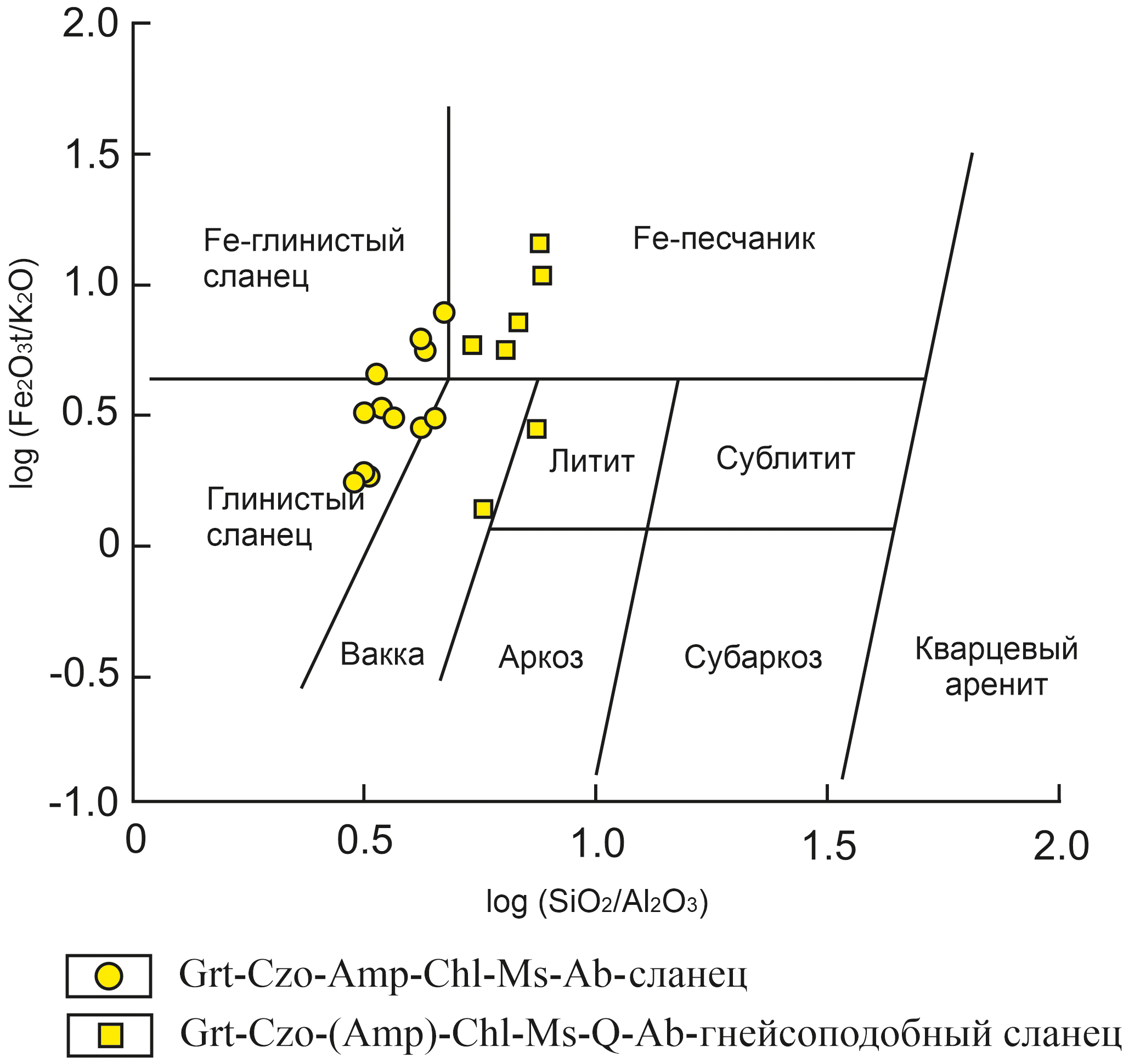 Для разделения сланцев на пара- и ортопороды была применена диаграмма А. Нематова, в которой использовались данные химического состава пород, представленные в таблице 1. На диаграмме А. Нематова преобладающее большинство фигуративных точек cоставов гранатсодержащих и гранатовых кварц-клиноцоизит-амфибол-хлорит-мусковит-альбитовых сланцев и гранат-мусковитовых гнейсоподобных пород попадают в область парапород (рис. 3). Подтверждают первичную осадочную природу этой группы сланцев данные дискриминантной функции DF(x) (Великославинский и др., 2013), значения которой находятся в пределах 0.35–1.74, и результаты анализа литохимических особенностей. На классификационной диаграмме М. Хиррона большая часть образцов попадает в область глинистых пород (рис. 4). Гранат-мусковитовые гнейсоподобные породы обнаруживают схожесть с железистыми песчаниками (единичные образцы находятся в поле литита и вакка). Выводы о первично-осадочном происхождении кристаллических сланцев были получены в работах предшественников (Пыстин и др., 1994; Ремизов и др., 2006; Кушманова, 2020).