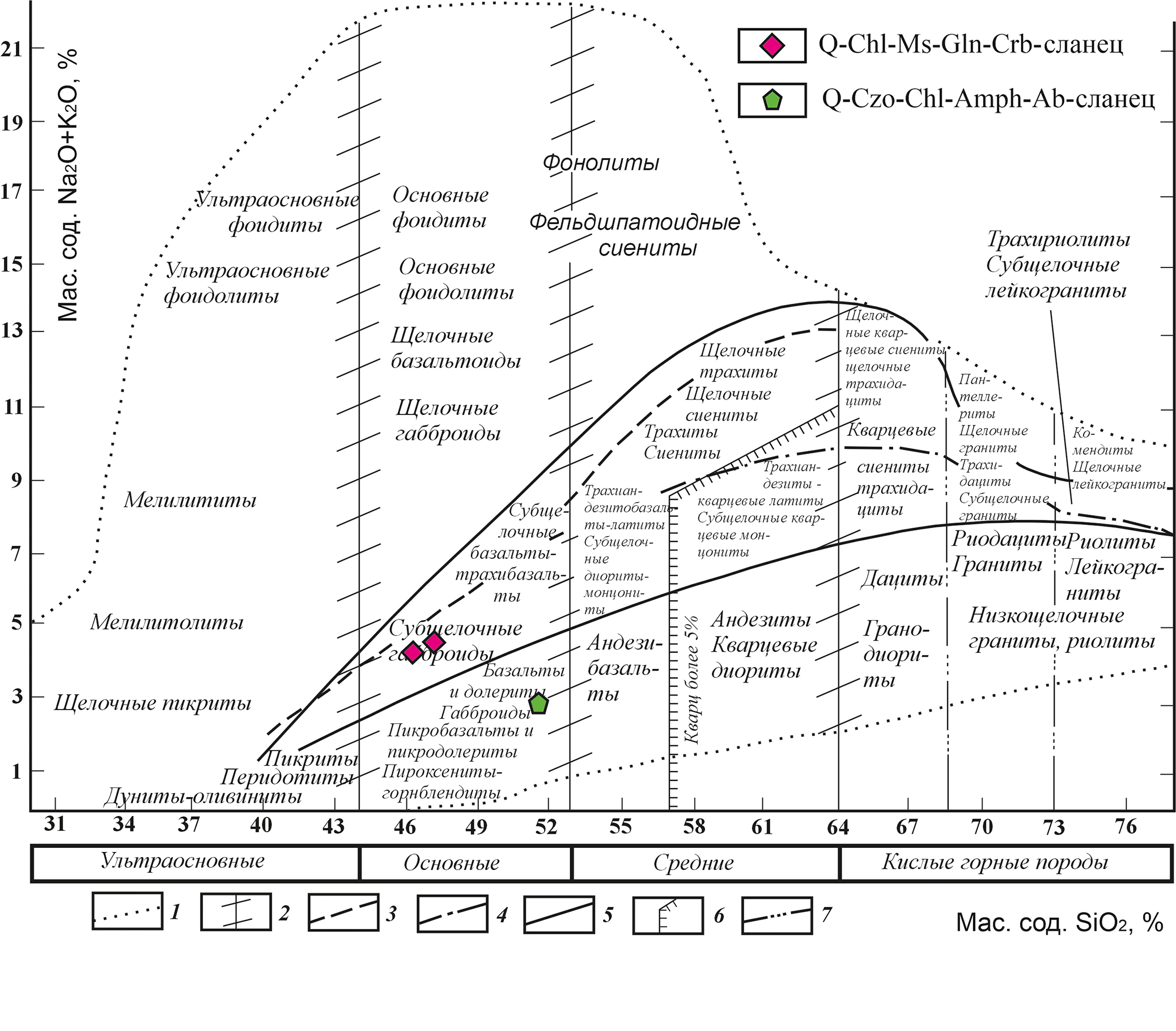 Несколько фигуративных точек кварц-хлорит-мусковит-глаукофан-карбонатного и кварц-клиноцоизит-хлорит-амфибол-альбитового состава пород проецируются в поле ортопород (рис. 3). Для реконструкции их первичного состава была построена диаграмма TAS, на которой фигуративные точки химического состава амфиболовых (глаукофановых) сланцев попадают в поле базальтов (габбро) либо располагаются в области субщелочных габброидов (рис. 5).