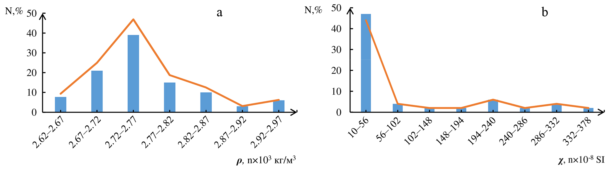 Рис. 6. Гистограммы и вариационные кривые плотности (a) и намагниченности (b) кристаллических сланцев неркаюского комплекса