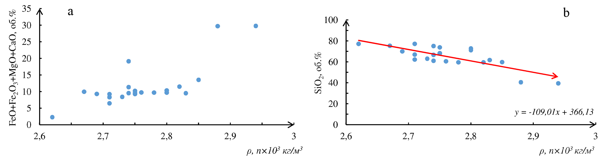 Fig. 7. Diagrams of the dependence of changes in schist’s density on the content of oxides: a — FeO + Fe2O3 + MgO + CaO; b — SiO2