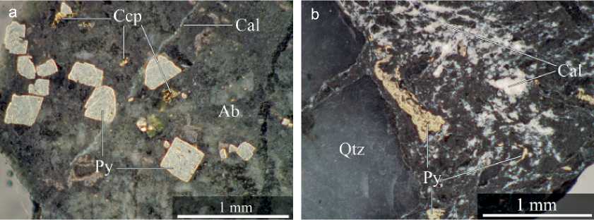 Рис. 1. Березитоподобные метасоматиты месторождения: a — вкрапленная минерализация (пирит), b — минерализация, связанная с кварц-карбонатными прожилками. Py — пирит, Ccp — халькопирит, Cal — кальцит, Ab — альбит, Qtz — кварц