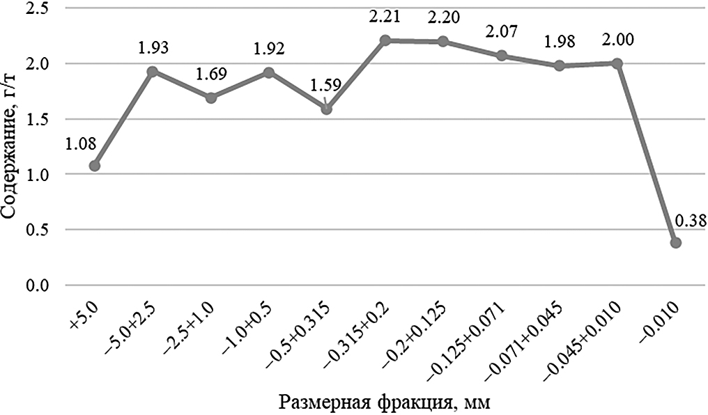 Наблюдается неравномерное распределение золота по классам крупности, что обусловлено различной морфологией благородного металла в метасоматитах. Значительные содержания золота отмечены в классах (мм): –0.315 + 0.2 и –0.045 + 0.010 = 2.21 г/т и 2.00 г/т соответственно. Самые низкие содержания отмечены в классе +5 мм и –0.010 мм: в первом случае они обусловлены недостаточным вскрытием матрицы метасоматитов, а во втором, вероятно, природным размерным распределением сульфидов, с которыми связано золото крупностью более чем –0.010 мм.