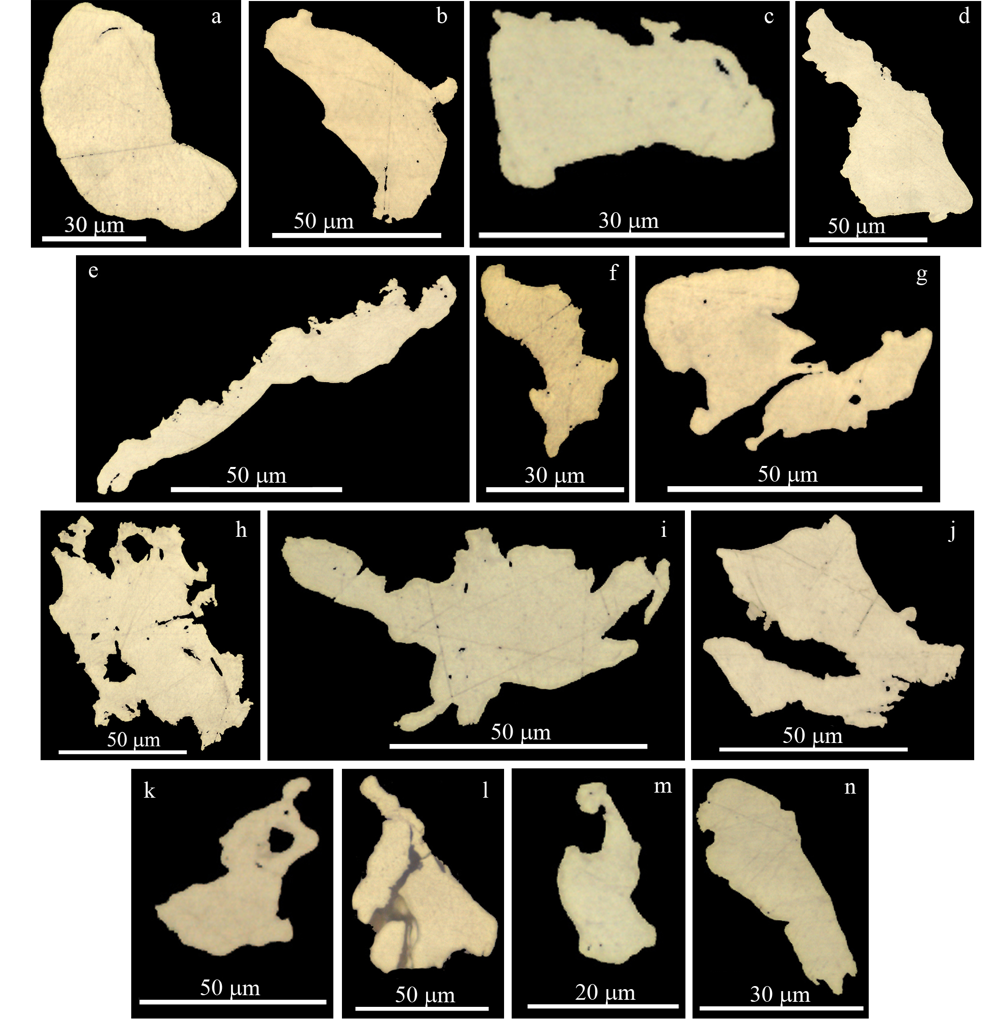 Рис. 3. Морфология самородного золота (фр. –0.2 + 0.010 мм): a–c — таблитчатые частицы, близкие к изометричным, d–e — золотины трещинно-прожилкового типа, f — удлиненная трещинно-прожилковая золотина, g–i — комковидные частицы золота, j–k — частицы золота интерстициального облика, l–n — гемиидиоморфные частицы самородного золота. HS-концентрат