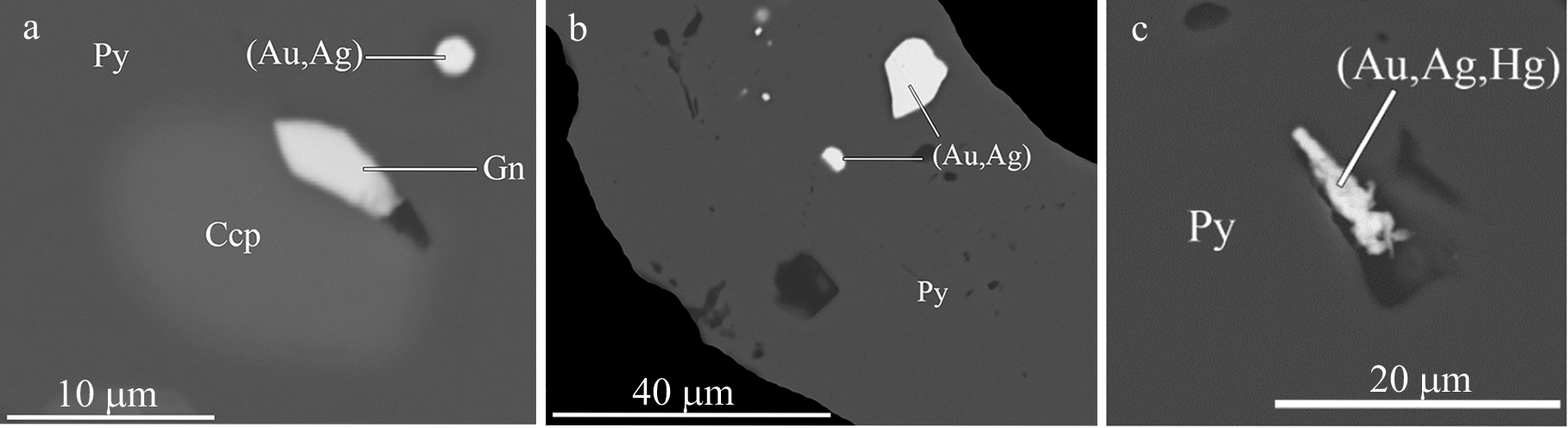 Частицы золота наблюдаются в виде включений в пирите (рис. 4), относятся к смешанному морфологическому типу золота (Николаева и др., 2023). Преимущественно встречаются мелкие округлые каплевидные обособления (характерная морфологическая разновидность для вкраплений золота в сульфидах) (рис. 4, а), также наблюдаются единичные более крупные таблитчатые изометричные частицы с округленными гранями (рис. 4, b) и ребрами и отдельное включение плохо ограненной удлиненной золотины с элементами расщепленного строения у ее окончания (рис. 4, с).