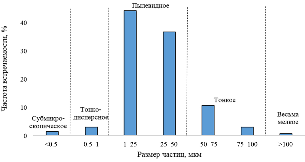 Рис. 5. Оценка встречаемости золота в метасоматитах месторождения по размеру частиц
