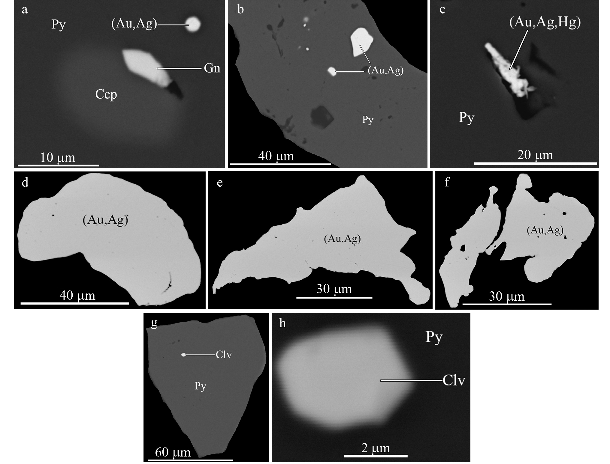 Рис. 6. Формы нахождения золота, полированный шлиф, BSE-фото. Ccp — халькопирит, Gn — галенит, Py — пирит, (Au, Ag) — серебристое золото, (Au, Ag, Hg) — ртутистое золото; Clv — калаверит; a–c — включения самородного золота в сульфидах, d–f — свободные частицы самородного золота, g–h — включение теллурида золота в пирите (калаверит). HS-концентрат