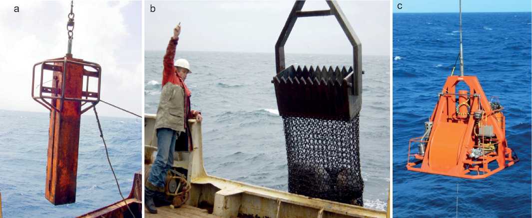 Fig. 2. Equipment for lifting substances from the bottom: a — box sampler; b — rock dredge; c — grab with video camera