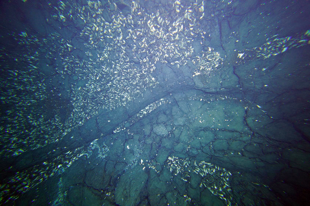 Рис. 4. Скопление типичной гидротермальной фауны (двустворчатых моллюсков) на базальтах, практически лишённых осадков. Кальдера вулкана Пюи де Фоль. Фотопрофиль 45L024t