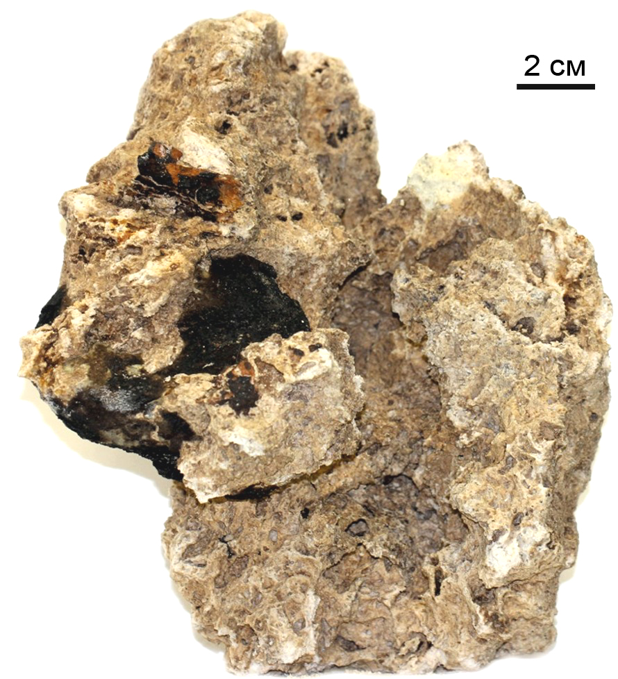 Fig. 7. White smoker structures in the form of pipes with a hollow channel. The front wall of both structures is broken off, the walls of the internal channels are covered with a coating of vernadite (black) with an admixture of goethite (brown). Vernadite (a) and Goethite (b) in the form of a coating, also develop on the outer wall of the structure