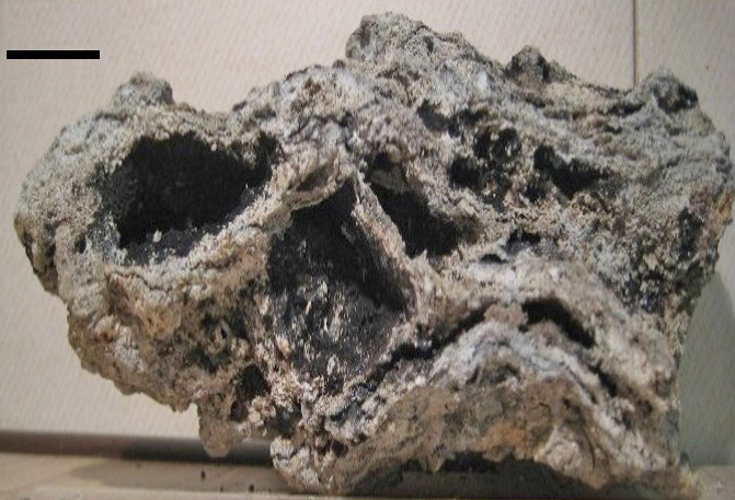 К белым курильщикам относится и баритовая постройка, в состав которой включены три обломка хлоритизированного базальта (один большой — 7 × 7 × 5 см — и два совсем мелких), покрытых железомарганцевыми «шубками» и корками (рис. 8). Эта постройка была поднята на южном склоне подводной горы в восточном борту рифтовой долины на широте 14°40′ вне рудных полей. Барит в ней сильно кавернозный и пористый, напоминает губку с большими ячейками, что более характерно для вулкано-фумарольных образований. Полости и каверны пусты. Отмечаются многочисленные флюидальные микротекстуры на внутренних поверхностях и стенках каверн. Барит диагностирован рентгенофазовым и оптическим методами.