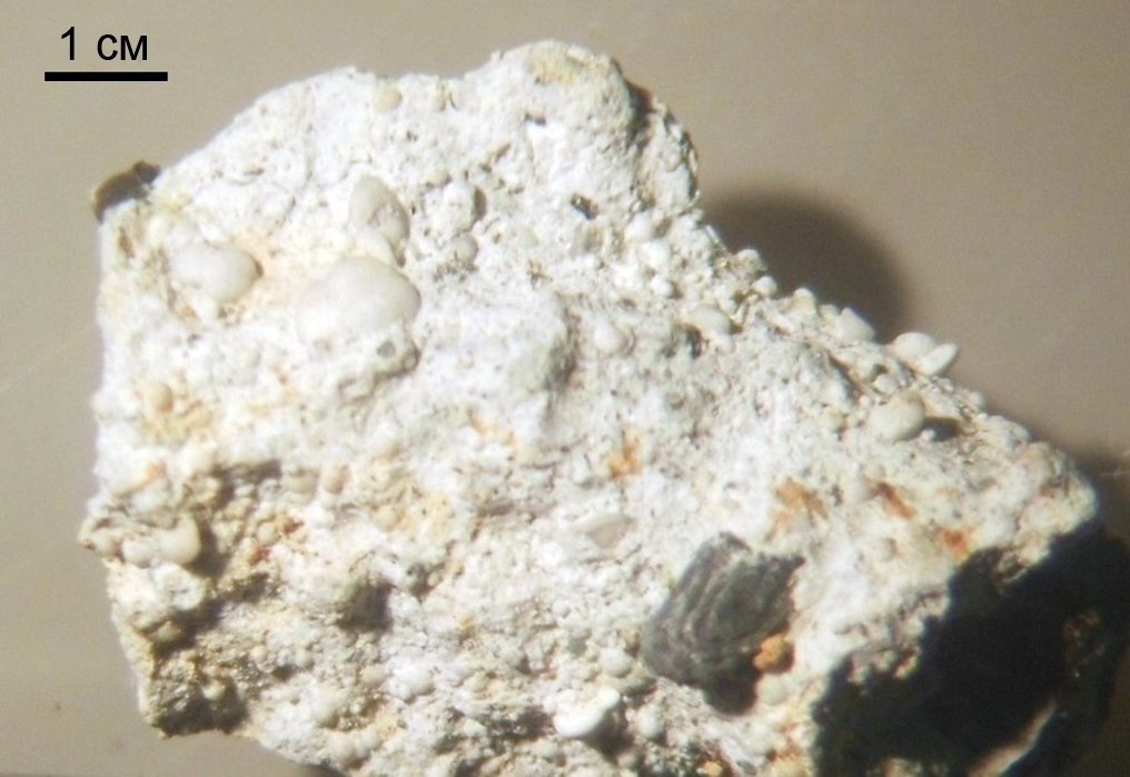 На юго-западном склоне горы, на 17° 09´ с. ш., в пределах рудного поля Победа была поднята небольшая труба белого курильщика опал-талькового состава, с преобладанием талька. В её наружной стенке наблюдаются замещённые тальком фораминиферы (рис. 10).