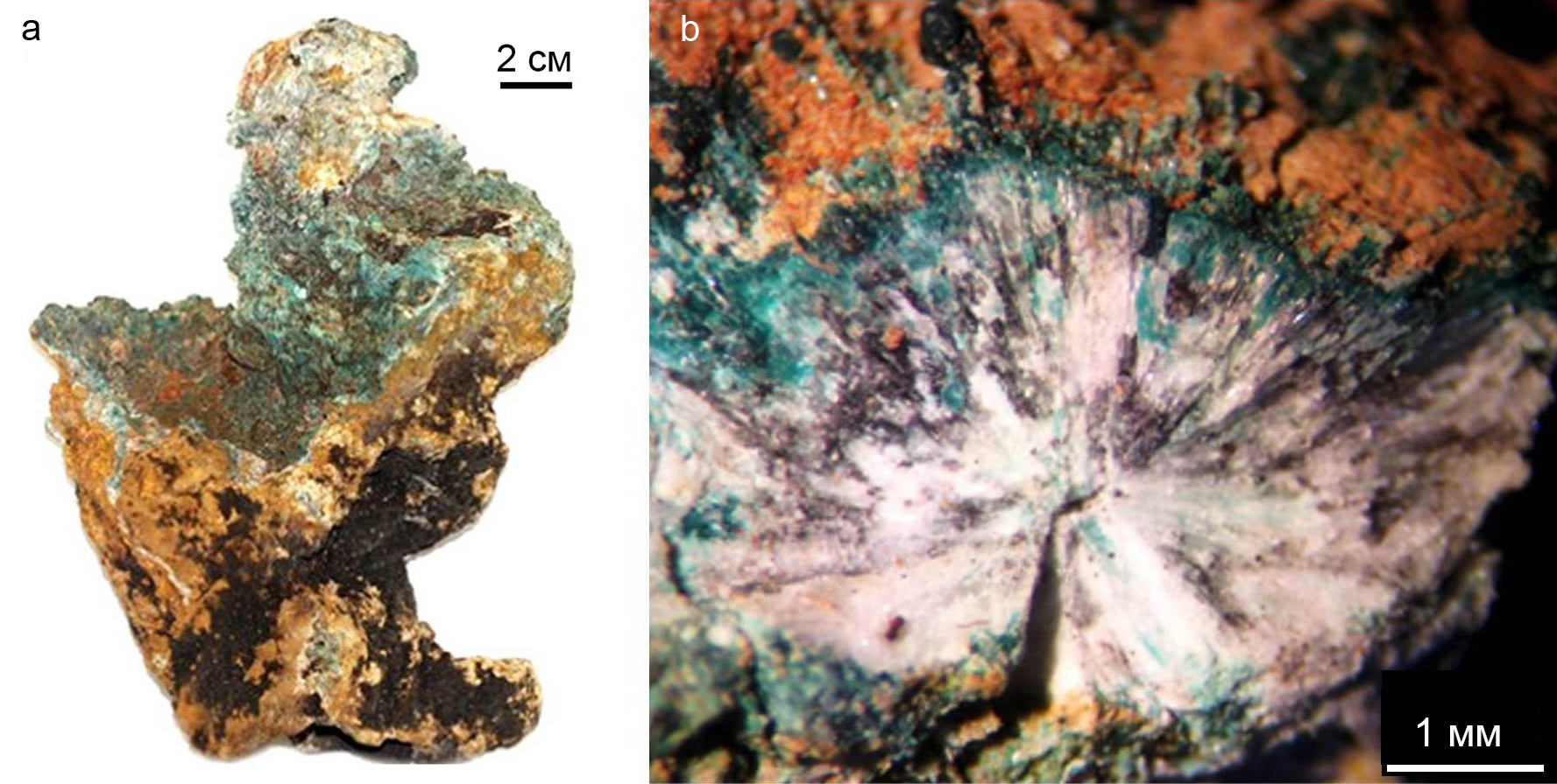 Рис. 12. Атакамит-арагонитовая постройка, станция 39L211d: а — форма с полым каналом, наружные стенки покрыты корочкой гётита (бурое) и минералами марганца (чёрное); b — радиально-лучистый арагонит с включениями магнетита (чёрное), атакамита (зеленое) и налётом оксигидроксидов железа (бурое). Увеличенный фрагмент торца стенки атакамит-арагонитовой постройки