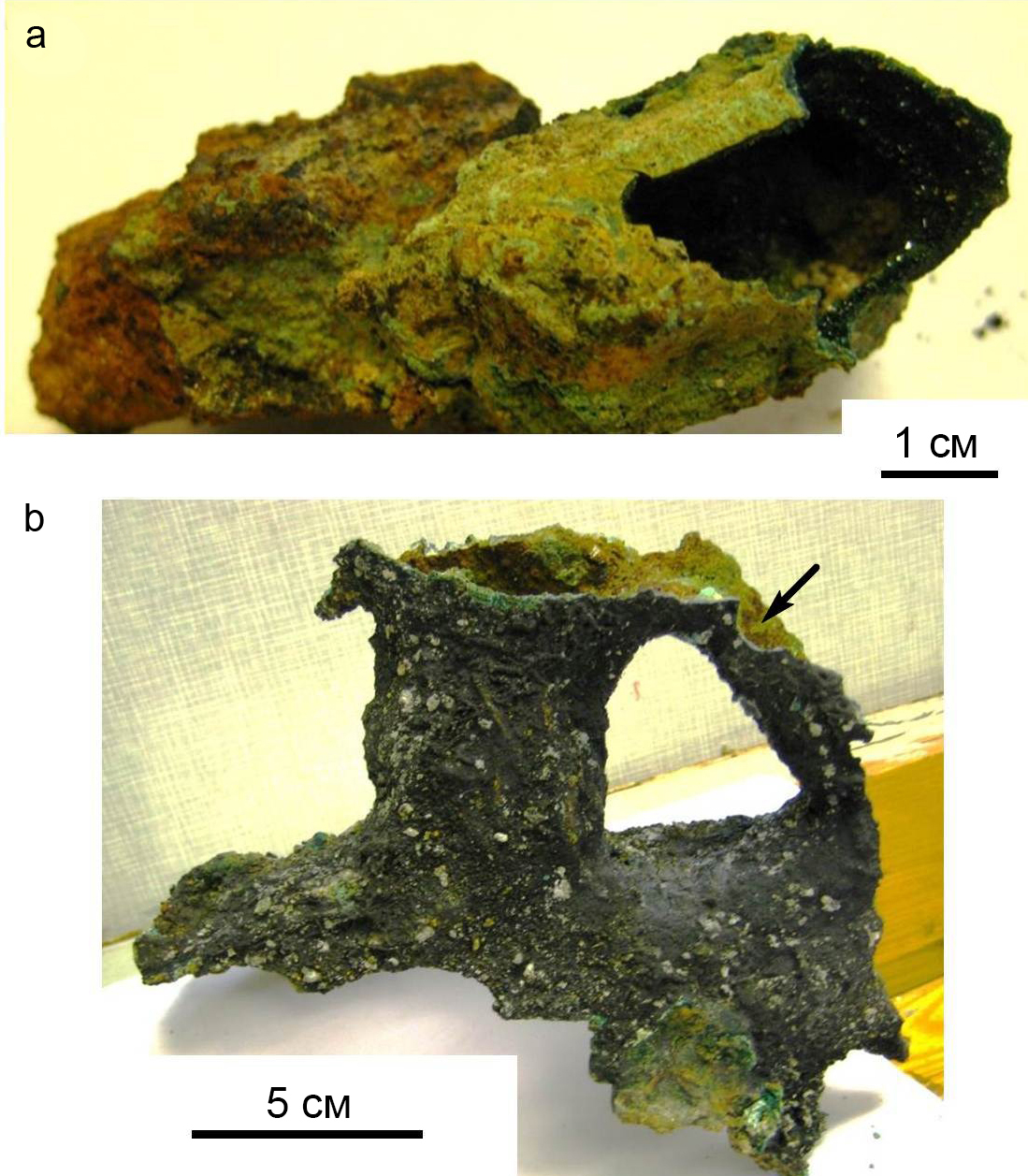 Fig. 13. A hollow chimney of a green smoker composed of atacamite group minerals and iron oxyhydroxides (a), and a splice of two hollow intersecting chimneys of a green smoker with relics of replaced foraminifera and a coating of manganese minerals on the walls (black), the arrow shows a fragment of a chimney with a broken wall (b). Ashadze-2 ore field. Station 30L233k