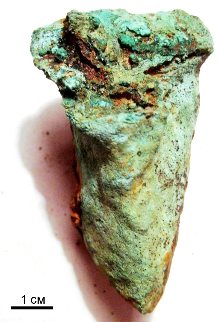 Fig. 14. Atakamite-paratakamite tube without hollow channel. Petersburgskoe ore field. Station 33L159g