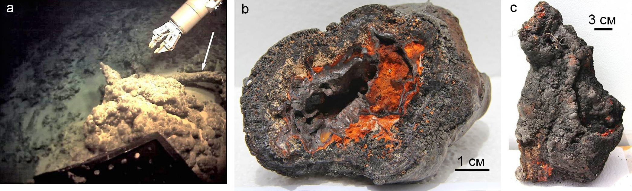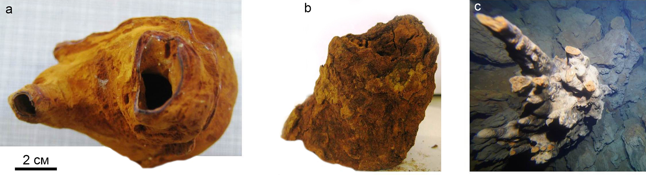 Рис. 15. Оранжевые курильщики: а — сросток двух полых труб, состоящих из порошковатых оксигидроксидов железа с бактериоморфными структурами, и концентрически-зональный прожилок аморфного железокремниевого вещества (тёмно-коричневое), служащего каркасом, станция 31L347k; b — полая труба, сложенная порошковатыми гидроксидами железа с бактериоморфными структурами, станция 33L063g; c — сросток запечатанных труб оксигидроксидов железа с минералами марганца, фрагмент фотопрофиля дна на станции 45L013t, рудное поле Пюи де Фоль