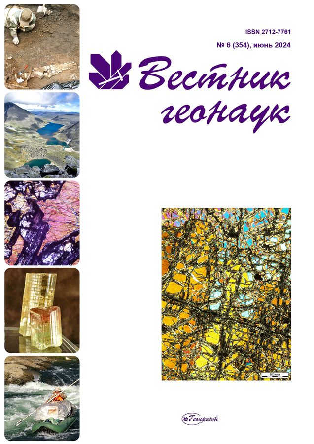 В статье приводятся результаты изучения самородного золота и минерального состава тяжелой фракции проб из зоны межформационного контакта среднедевонских и среднерифейских отложений, вскрытой канавой в верховьях ручья Волчий (приток р. Цильмы). В тяжелой фракции преобладают титановые и редкоземельные минералы. Самородное золото мелкое (0.25—1.0 мм), с рудным обликом, низкой степенью окатанности и разнообразными формами. В золоте содержание Ag составляет до 10.3 мас. %. Пробность — 899—1000 ‰. Внутреннее строение золота неоднородное и характеризуется зернистой блочно-мозаичной структурой. В золоте установлены включения пирротина, пирита, галенита и арсенопирита. Включение пирита в золоте по составу аналогично включению пирита в кварце. Золото отмечается в срастании с кварцем, реже мусковитом. Впервые на Среднем Тимане установлено срастание золота с рутилом. Рутил имеет примеси V, Nb, Fe. Предполагается, что коренными источниками изученного золота являются зоны развития золото-кварц-сульфидной вкрапленной минерализации, локализованные в рифейских сланцевых толщах, и секущие их кварцевые жилы. Характер отложений, их минеральный состав, морфология и состав золота исследуемого межформационного контакта имеет сходство с комплексной алмаз-золото-редкоземельно-редкометалльно-титановой палеороссыпью Ичетью, что позволяет прогнозировать присутствие подобных рудных объектов в пределах не только Цилемского поднятия, но и всего Тимана.