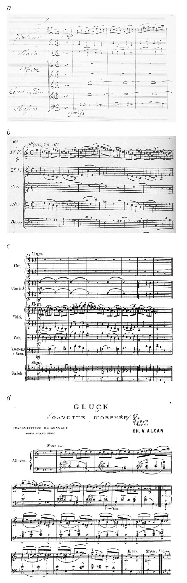 Ил. 3. К.В. Глюк. Гавот из 3-го акта оперы «Орфей и Эвридика». К.В. Глюк. Партитура: редакции: а – «Итальянская», 1762 (т. 1-3); b – «Французская», 1774 (т. 1-3); c – редакция Г. Аберта, 1914 (т. 1-3); d – транскрипция Алькана