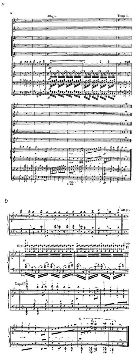 Ил. 6. В.А. Моцарт. Сцена «В пыли и пепле» («Ne pulvis et cinis superbe») из музыки к постановке «Тамос, король Египта» (K. 345): a – В.А. Моцарт. Манускрипт 1779 г. № 7, Andante Moderato (т. 1-3); b – Алькан. Транскрипция Ne pulvis et cinis superbe, Andante maestoso (т. 1-3)