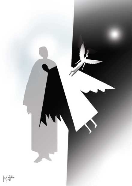 Постоянный художественный прием в графике Маркарова – разделение листа на черную и белую половины. Ангел как воплощенный образ надежды на спасение достигает своего апогея в листе 2020 г. «Разгоняя тьму». Произведение наполнено аллегориями: хрупкое равновесие света и тьмы, ангелы – парящий и почти падший, солнце, с трудом пробивающее толщу злой черноты, смутная тень то ли человека, то ли Бога. Что там у него над головой: нимб или просто облачко? Линии, разлетающиеся в разные стороны, создают ритмический рисунок полотна, заставляющего нас застыть в глубоком раздумье.