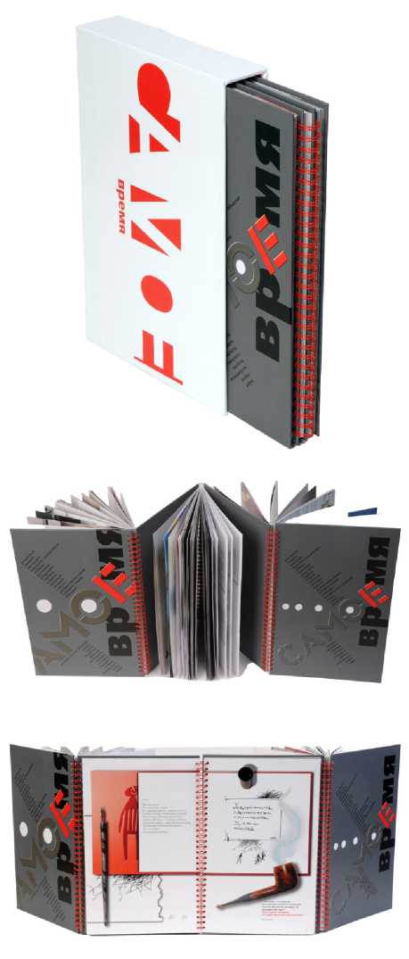 Поэтическое издание «Самое время» подобно движению декораций, которые постоянно меняются, то выступая на передний план, то отдаляясь от зрителя. Сложность содержания диктует нестандартное решение как самого дизайна книги, так и ее структуры. И эти своеобразные композиционные уровни в книге находятся в постоянном динамическом развитии линии, формы, цвета и света, проступающего сквозь пространство, созданное изобразительным рядом. В статичной книге появляется реальное движение. Каждый элемент продиктован общей формой, и каждая деталь определяется другой. В этом взаимодействии плоскости листа и пространства, раскрывающегося в нем, создается гармония взаимоотношения стихов и иллюстраций, фотографий и афоризмов.