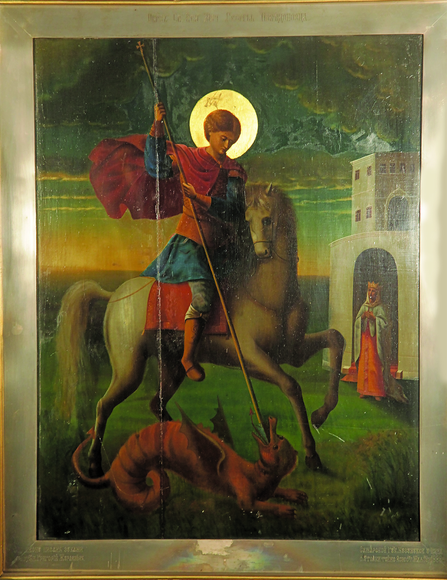 Fig. 1. G.N. Zhuravlyov. Image of the Holy Great Martyr George the Victorious. May 19, 1889. Wood, oil. 70 × 56 cm. Pukhtitskiy Monastery of the Dormition, Estonia. Inscription in the lower left corner: “The icon was painted by peasant Grigory Zhuravlyov with his teeth,” the inscription in the lower right corner: “Samara province, Buzuluk district, village Utevka of the same volost May 19, 1889.”
