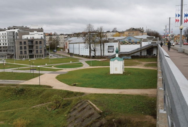 Центральная часть района Завеличье, где расположена часовня, сформировалась под влиянием двух основных исторических факторов – наличия переправы через р. Великую к центру города и единого пространства, образованного в XV в., которое использовалось в торговых, религиозных и бытовых целях – так называемого Пароменья (ил. 1, 2). Здесь же начиналась церемониальная дорога западных дипломатических и торговых миссий.