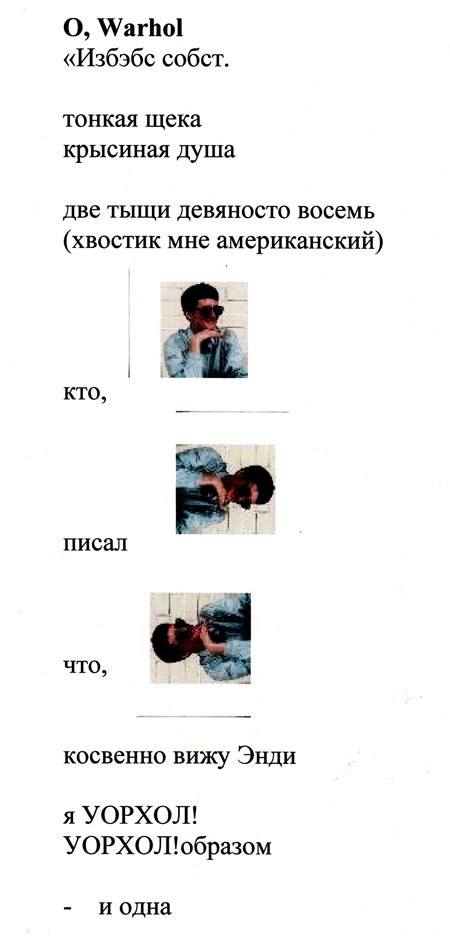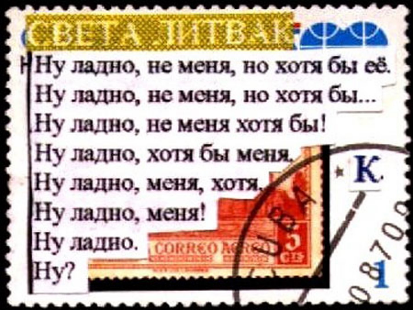 Обозначенные выше теоретико-методологические установки в определенной степени позволяют реконструировать сложное субъектное поле визуального стиха. Будет уместным также упомянуть тезис В.-Г. Вестстейна о том, что в контексте экспериментальной поэзии, «когда “я” отсутствует и поэтический язык сам выходит на передний план, целесообразно использовать термин “лирический голос”, в случае визуальной поэзии – “лирический взгляд”» [12, р. 39]. В творчестве С. Литвак подобная самопрезентация, например, наиболее четко прослеживается в стихах с использованием своих фотографий или упоминанием своего имени, что наглядно демонстрирует частичное включение в текст собственного поэтического «я»1.