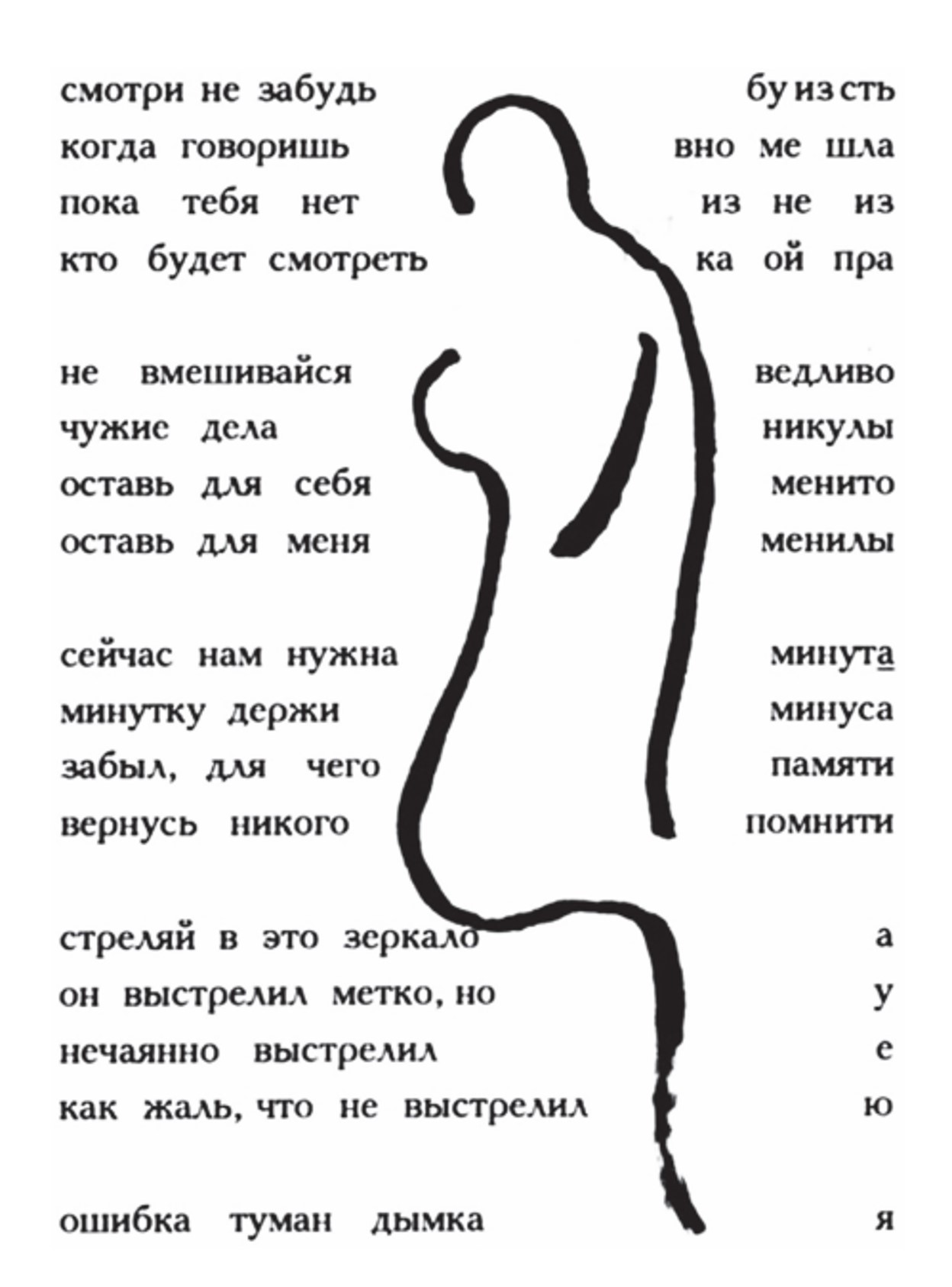 Важно то, что, так или иначе, реципиент, имеющий огромное значение как звено дискурсивной коммуникации, в визуальной поэзии приобретает фактически экзистенциальный статус в силу гетерогенности декодирования, без которого чтение визуального текста не представляется возможным17. Однако одновременно читатель должен изначально обладать необходимыми навыками и компетенциями для его «расшифровки», находясь таким образом в пограничной ситуации своей «открытости» и «закрытости» с точки зрения семиотики.