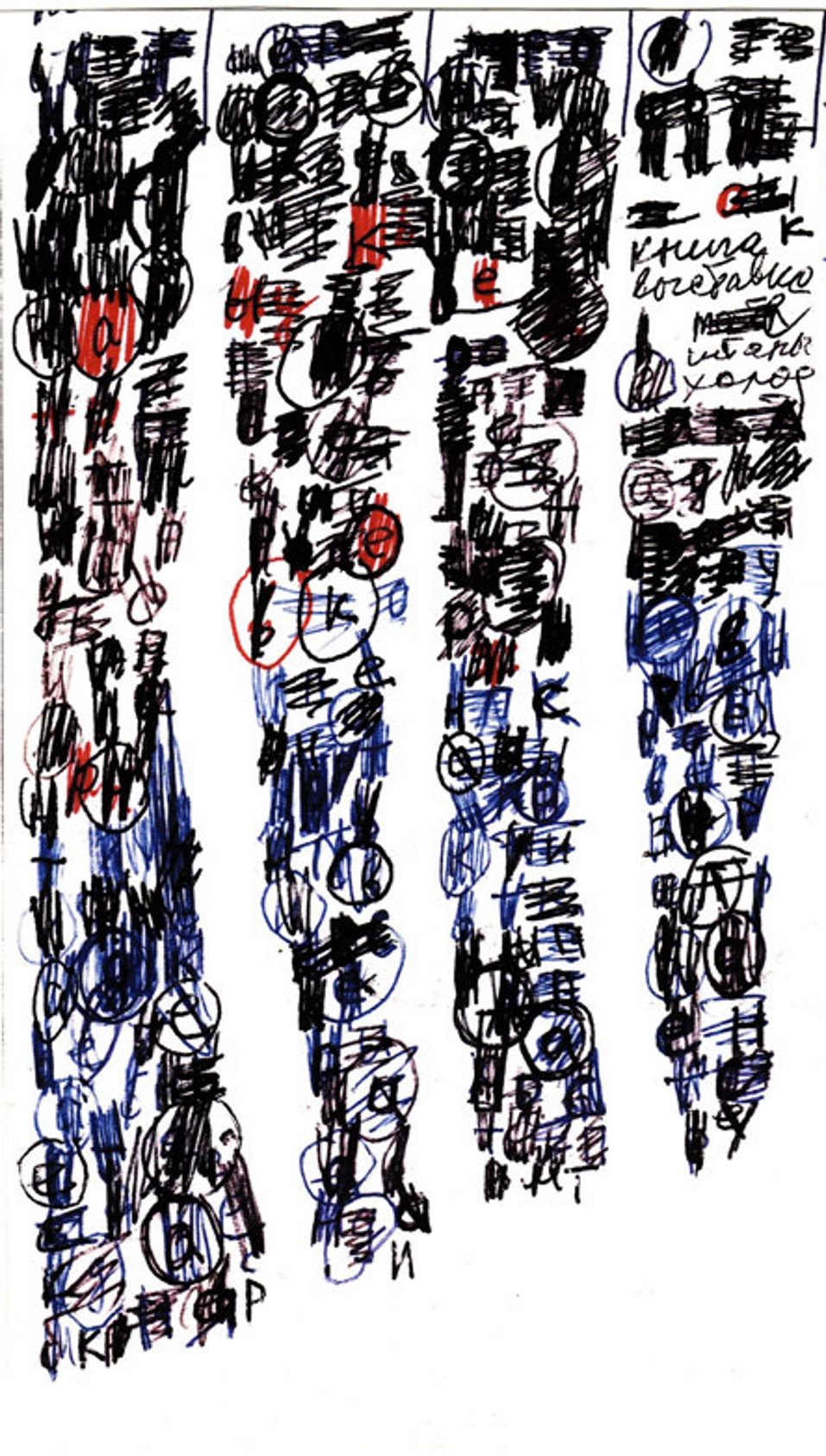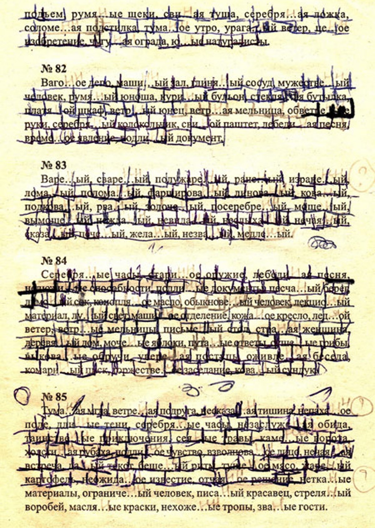 В этой связи особенно интересны стихотворения, выполненные в технике блэкаут, которые – что даже следует из наименования практики – и по форме, и по содержанию максимально «закрыты» (см. ил. 8), а также асемическое письмо (см. ил. 9) и гипервизуализированные тексты (см. ил. 10, 11 и 12).