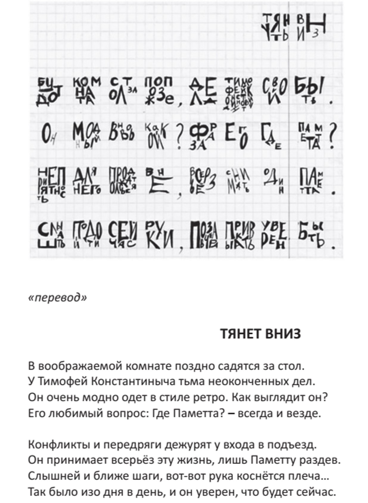 «Открытость» визуальных текстов С. Литвак проявляется наиболее широко, в первую очередь в фигурной поэзии, где словесный или фонетический компонент в определенной мере превалирует над визуалом (см. ил. 13 и 14), а также в визуальных стихотворениях с авторским «переводом» (см. ил. 15).