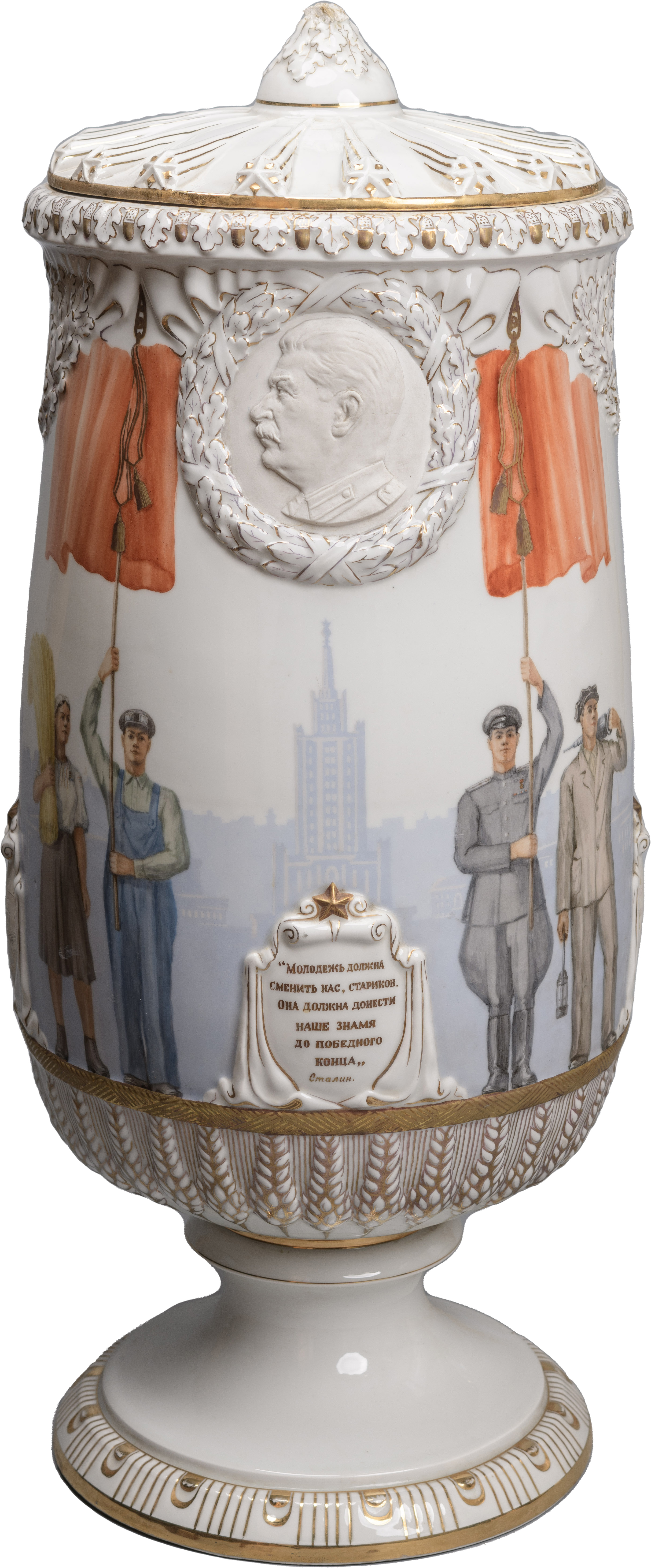 Особую популярность приобрели портреты вождей. На предприятиях страны начали выпускать крупные вазы с торжественным содержанием росписей. В качестве примера можно привести произведение Н.Г. Кондратьевой «Под знаменами В.И. Ленина» (1950-е гг.) (ил. 2) из фондов Новгородского музея-заповедника. Верхняя часть экспоната украшена барельефами с портретами В.И. Ленина и И.В. Сталина в обрамлении венков из лавровых листьев, ниже, на фоне высотных зданий – росписи с парными изображениями: рабочий и колхозница, солдат и матрос, шахтер и железнодорожник, студент и студентка, кроме того, ваза украшена надписями-лозунгами: «Молодежь должна сменить нас, стариков. Она должна донести наше знамя до победного конца. Сталин», «Вы должны построить коммунистическое общество. Ленин». Основание вазы украшено барельефом в виде колосков пшеницы. Примечательно, что роспись в этот период играла более значительную роль, нежели форма.