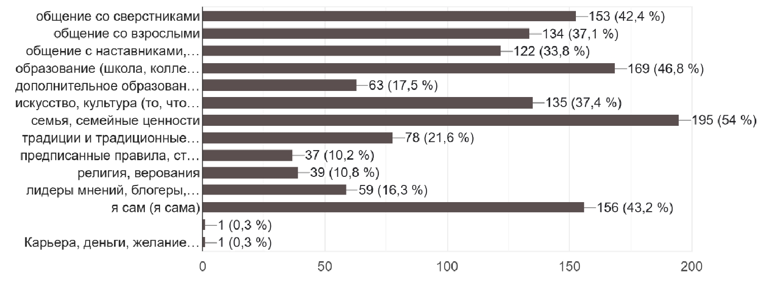 Один из вопросов анкеты был посвящен выяснению того, каким образом происходит передача ценностей (вопрос № 3 «Что больше всего влияет на Вас?»). Безусловное лидерство за семьей (53,6 % респондентов) и образованием (45,6 %). На третьем месте – вариант «Я сам(а)» (43,7 %), что отражает, скорее всего, возрастные особенности респондентов или их нежелание задуматься при ответе на вопрос. В то же время это выбор диагностирует выраженную тенденцию к и индивидуализму, которая отвечает возрастным особенностям и потребностям респондентов, но верифицирует определенные риски личностной автономии и переоценку собственной значимости. На четвертом месте – друзья и сверстники (42,3 %) (рис. 1).