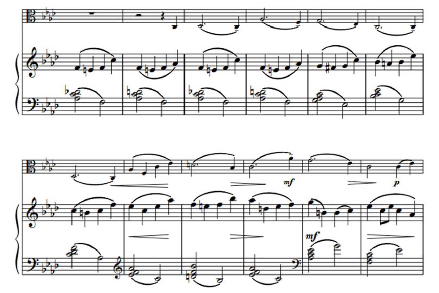 Пример 2. В.Я. Шебалин. Соната для альта и фортепиано, ор. 51 f-moll (1954). Часть 1, фрагмент главной партии, т. 7-12: