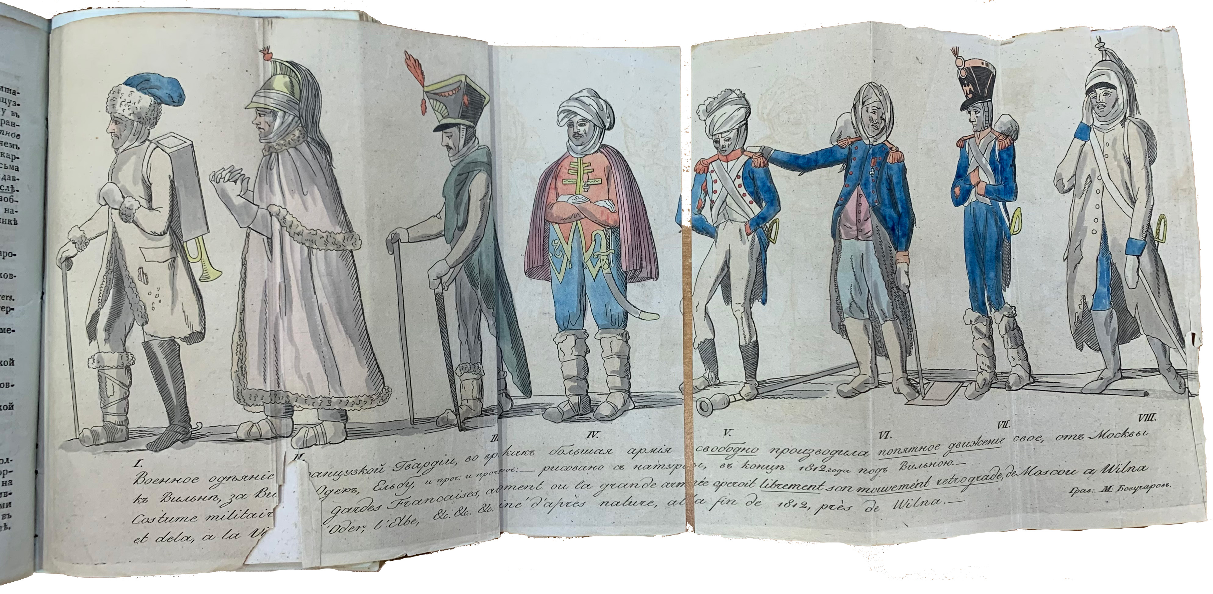 В каталогах Д.А. Ровинского [11, стб. 100-101 (2-й ряд)] и справочнике В.А. Верещагина [10, стб. 109, 115] встречаются только две картинки, в описаниях которых четко сказано, что они были приложены к изданию. Однако известно, что, несмотря на свою безусловную ценность, исследования искусствоведов не лишены неточностей и лакун. Дабы исключить вероятность ошибки, проведем анализ и сравнение внешних характеристик журнала и гравюр. Для начала рассмотрим комплект, хранящийся в РНБ (1/410). Высота переплетов с выпусками журнала – 20-21 см, длина – 13-14 см. В период с 1812 по 1815 г. (время военных действий против Наполеона и французской армии) нам встречаются всего две карикатуры. Первая – «Военное одеяние французской гвардии во время как большая армия свободно производила попятное движение свое от Москвы к Вильне за Вислу, Одер, Эльбу, и проч., и проч. и проч.» вышла в 1813 г. в Ч. 5, № 19. Офорт выполнен Михаилом Богучаровым и напечатан на бумаге верже (рис. 5). Размер листа – 43,8 х 18,3 см. Он сложен в 6 раз. Вероятно, позже бывшим владельцем этого экземпляра в журнал была вклеена еще одна, точно такая же гравюра, только раскрашенная и выполненная на очень тонкой бумаге (рис. 6). Она могла быть вырезана из другого экземпляра издания. Лист в плохой сохранности, имеет многочисленные надрывы.