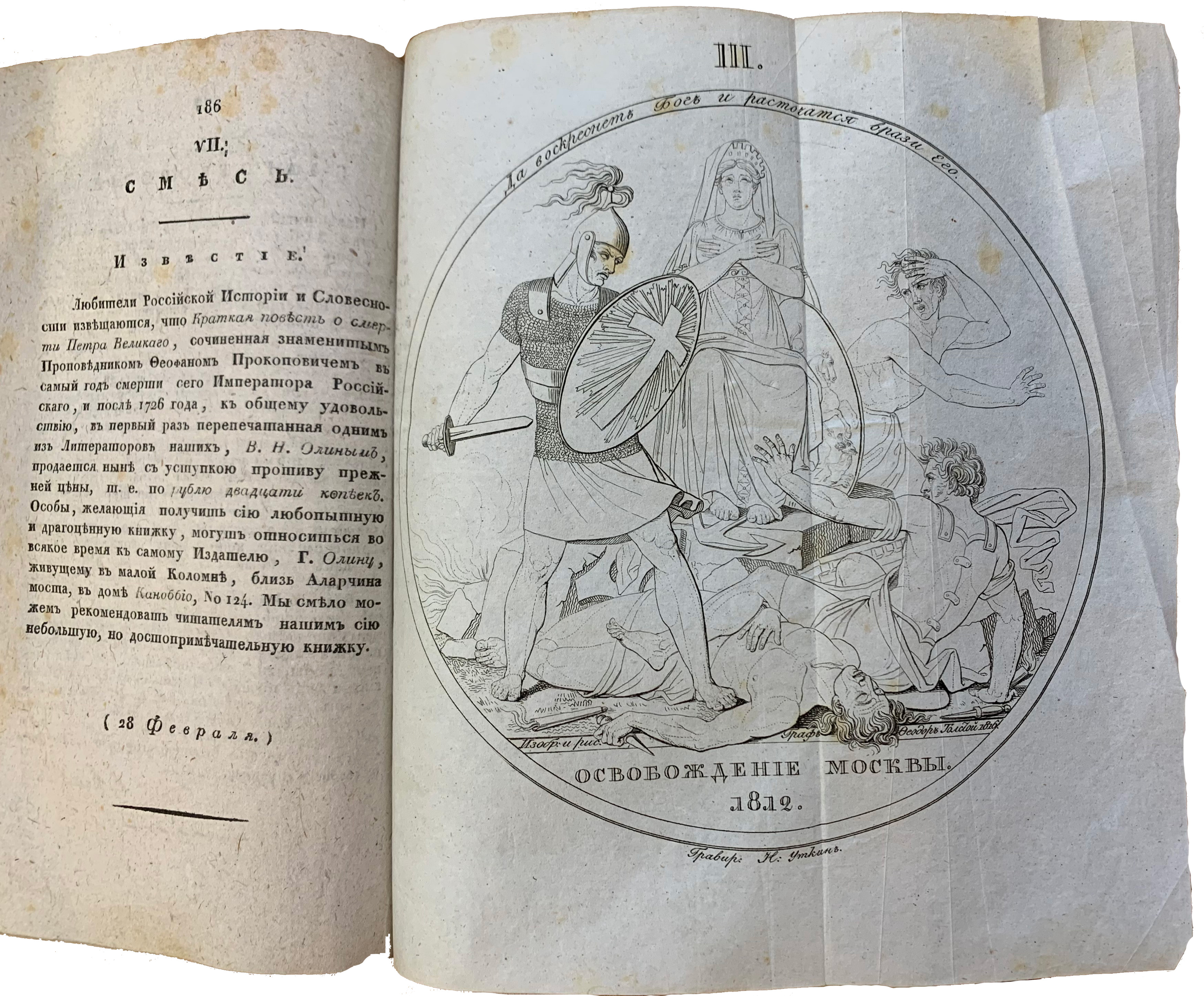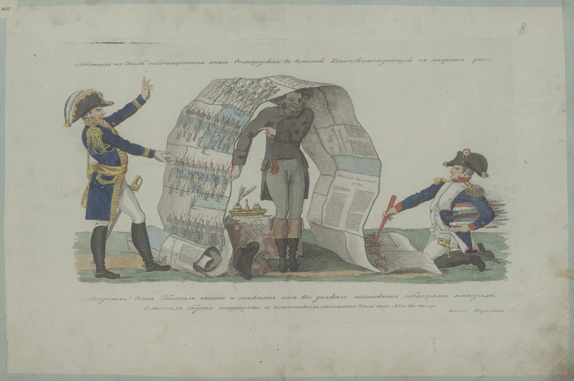 В октябре 1812 г., в самый разгар Отечественной войны, вышел в свет первый номер знаменитого журнала Николая Ивановича Греча «Сын Отечества»1. Патриотическая направленность издания сразу же поместила его в авангард антинаполеоновских настроений. Связь редакции с походной типографией Главного штаба позволяла журналистам оперативно освещать события на фронте. Авторы стремились поднять боевой дух читателей и усилить их веру в скорейшую победу. Помимо новостей на страницах журнала печатались забавные рассказы и анекдоты. В них высмеивались неудачи французской армии: промахи военного руководства, убогий походный быт солдат, неуемные геополитические аппетиты Наполеона. Для большего впечатления к статьям прикладывались карикатуры. Так, в российской прессе набрал популярность жанр иллюстрации2.