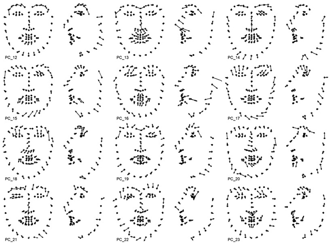 Рис. 2. 2D визуализация NRSP p_12 … p_23 (анфас и профиль). Примечание: Стрелки указывают направление смещения каждой из ключевых точек. Длина стрелок соответствует весу соответствующего параметра +80.