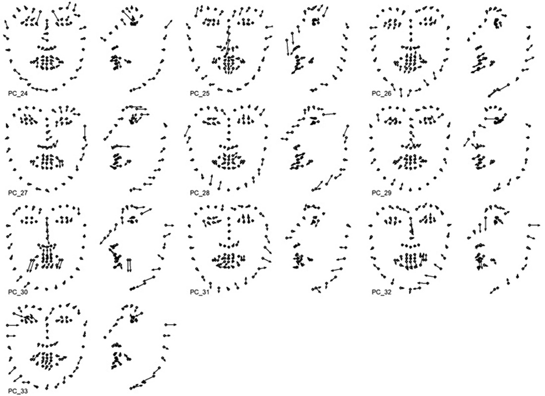 Рис. 3. 2D визуализация NRSP p_24 … p_33 (анфас и профиль). Примечание: Стрелки указывают направление смещения каждой из ключевых точек. Длина стрелок соответствует весу соответствующего параметра +80.