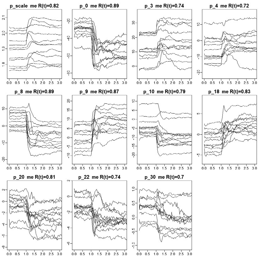 Анализ на уровне подстроечных параметров PDM и AU позволил выделить 11 подстроечных параметров и 2 AU, характеризующихся хорошей временной согласованностью. Список показателей приведен в Таблице 1. Временная развертка первых трех секунд динамики показателей представлена на Рис. 4, 5.