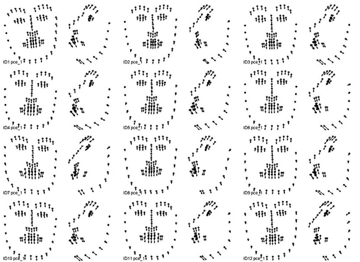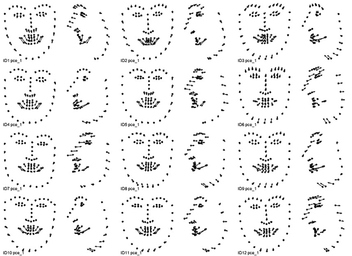 Рис. 24. Пространственная реконструкция первой главной компоненты для 12 наборов данных (экспрессия гордости). Примечание: Показаны средние значения координат ключевых точек и вектора изменения их положения. Рисунок демонстрирует низкую вариативность первой главной компоненты для включенных в анализ наборов данных.