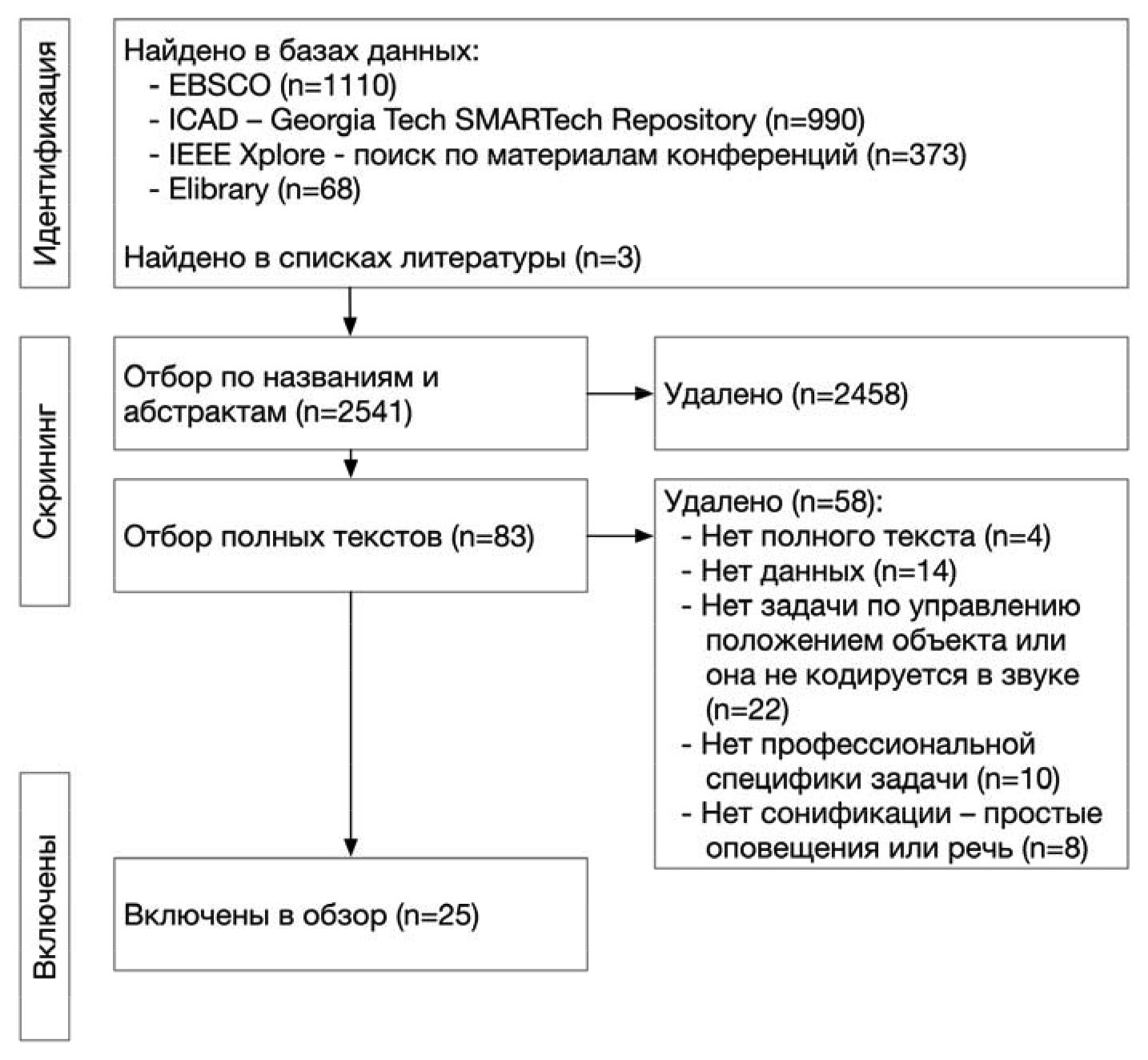 Отбор литературы. Поиск литературы осуществлялся в базах EBSCO в ноябре 2023 г. и через поисковые системы по тезисам конференций ICAD (Georgia Tech SMARTech Repository) и IEEE (IEEE Xplore) весной 2024 г. Использовались ключевые слова: sonification, auditory interface, auditory display (в неспециализированных базах EBSCO и IEEE), navigation, positioning (в базе ICAD, специализирующейся на слуховых интерфейсах и сонификации). Поиск русскоязычных источников осуществлялся по базе Elibrary; использовалось ключевое слово «сонификация». Поиск включал т.н. «серую» литературу (тезисы, диссертации), чтобы снизить эффект архивного ящика (искажение в пользу публикации значимых результатов).