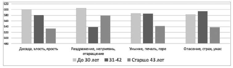 По возрасту испытуемых были обнаружены статистически значимые различия выборов эмоций по следующим группам: досада, злость, ярость (p=0,002); раздражение, неприязнь, отвращение (p=0,002); уныние, печаль, горе (p=0,006); опасение, страх, ужас (p=0,003) (рис. 3).